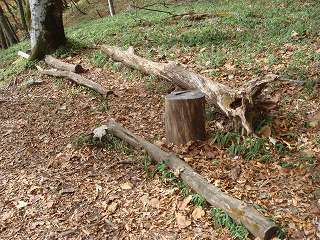 炭焼き窯の隣に腰を下ろしやすい倒木があって、ここに掛かる丸太橋を渡ったら 沢から