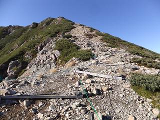仙丈小屋に下りる分岐から15分登った所で 山頂手前にある急斜面を登ります。