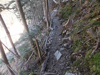 迂回路から樹林帯に入ると、そこから 傾斜がきつく荒れた登山道を下ります。