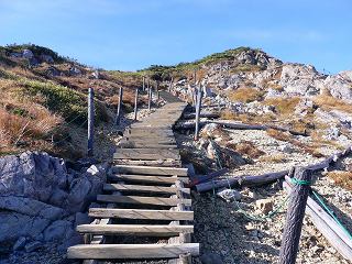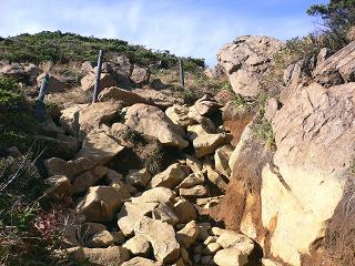ベンチの先で ちょっとした岩場を通過したら、その先で 傾斜のきつい階段を登ります。