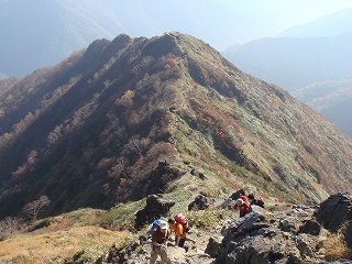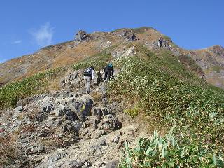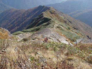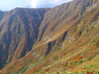 左にある天神平までの山腹には紅葉が広がっていて、振り返ると 巻機山と朝日岳が見え