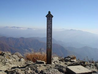 肩ノ小屋から25分下りた所にある天狗ノ腰かけ岩では、西に 川棚ノ頭とオジカ沢ノ頭が