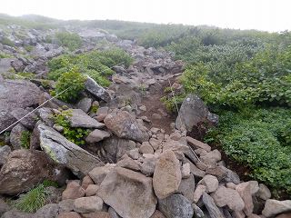 岩だらけの斜面を横切ってハイマツの中の急斜面を登ると 足元が安定しない道になります。
