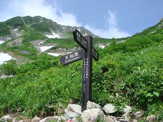 ___-(槍沢大曲に立つ道標)____________(槍沢キャンプ場)