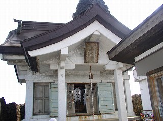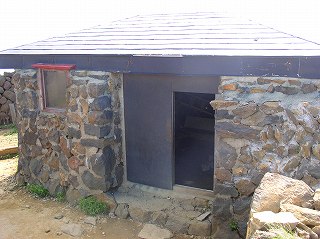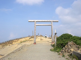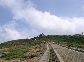 (熊野岳の山頂、奥は避難小屋と神社)