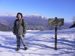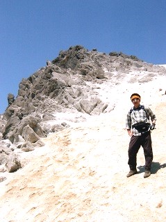 ___(山頂直下の白砂の斜面)________(山頂の標柱、後ろは甲斐駒ヶ岳)