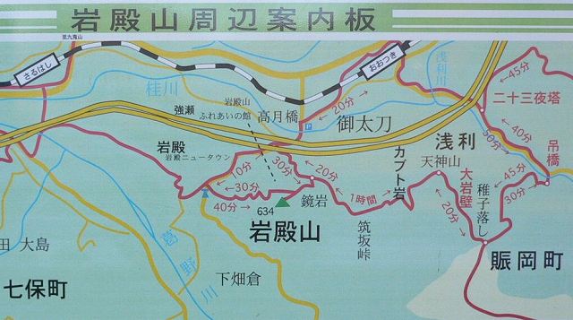 (駐車場にある案内板、現在地は岩殿山の左にある登り40分、下り30分の所です)