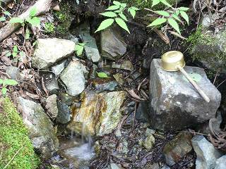 ある湧き水の出口にヒシャクがありました。