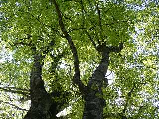 紅葉台から傾斜が緩くなって、登山道の上にはブナの巨木が新緑の枝を広げていて